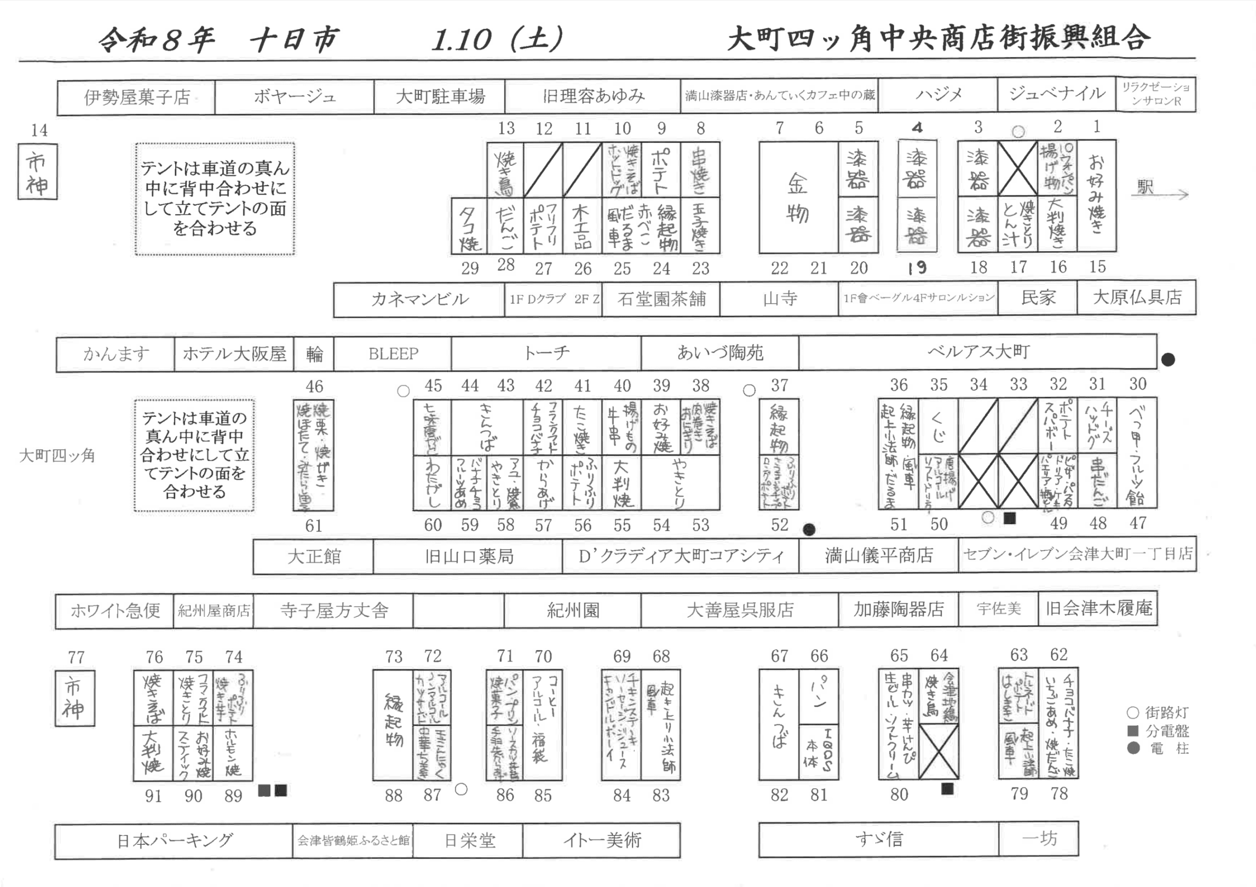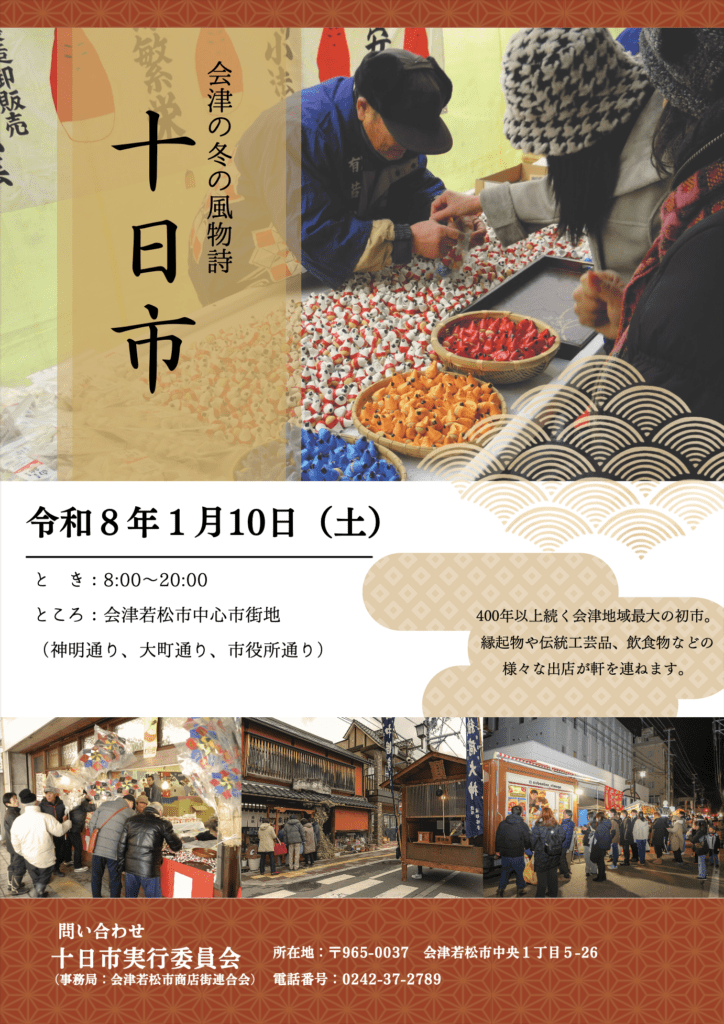 2025年12月12日 / 最終更新日時 : 2026年1月9日 お知らせ 令和8年度 十日市のお知らせ 会津最大の初市「十日市」が、令和8年1月10日(土)に開催されます! 縁起物の初市や地元のお店が立ち並び、まち全体が新年のにぎわいに包まれます。 一年の無事と商売繁盛を願いつつ、どうぞ温かくしてお越しください。 大町四ッ角エリアの出店予定図は下記のとおりです。 主催:会津若松市十日市実行委員会事務局:会津若松市商店街連合会(0242-37-2789)